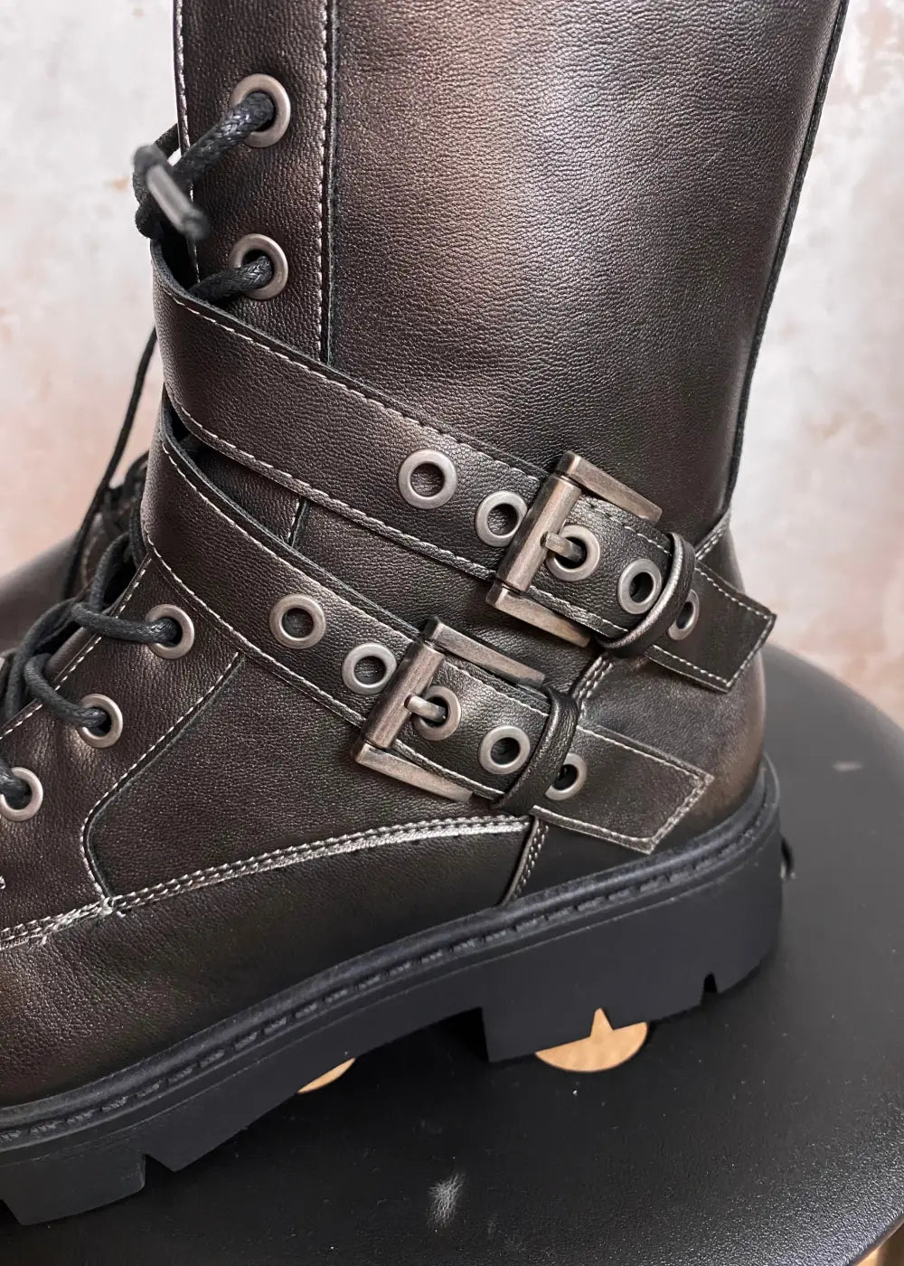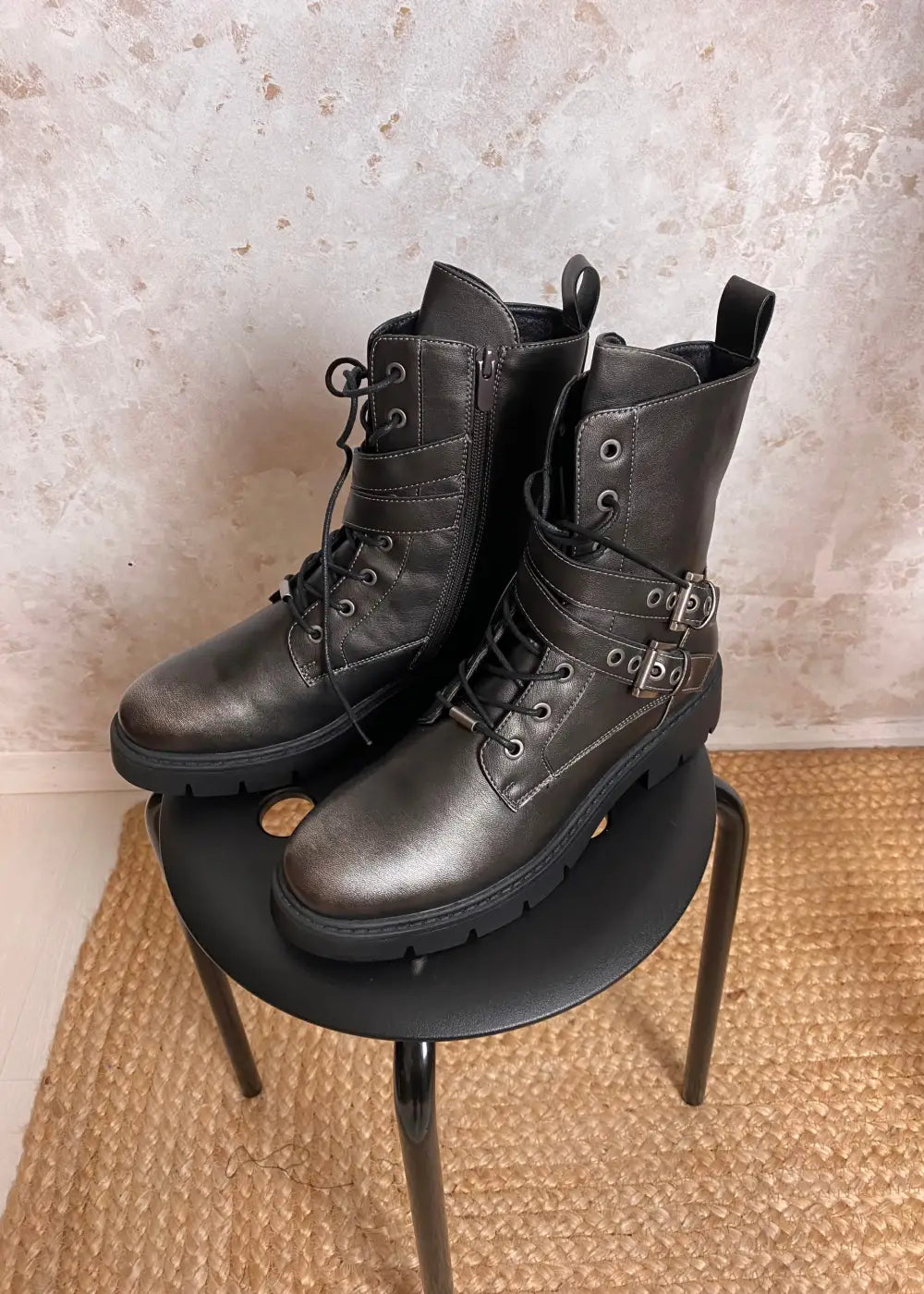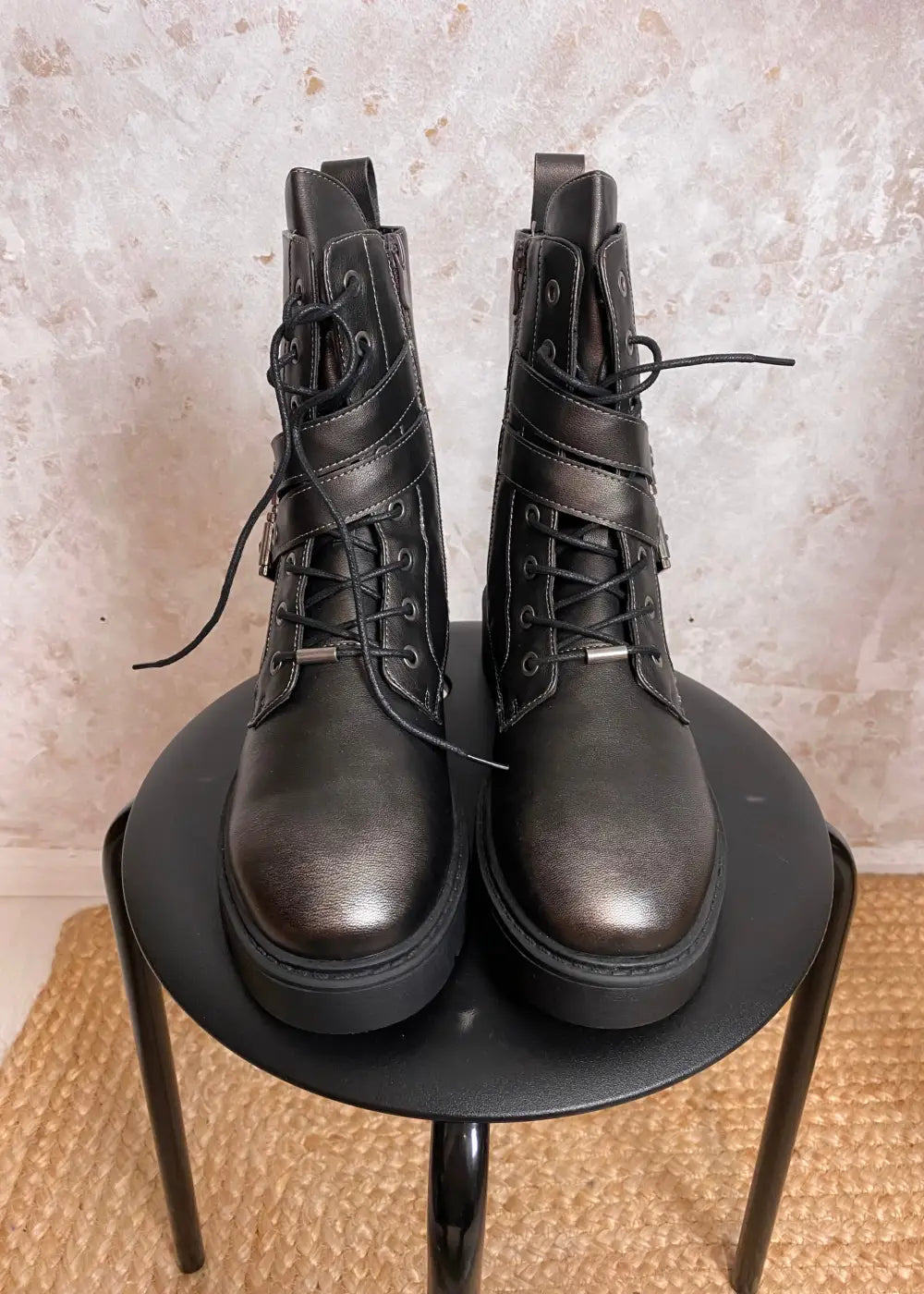 - Edessä säädettävät nauhat ja soljet korostavat rouheaa tyyliä ja istuvuutta