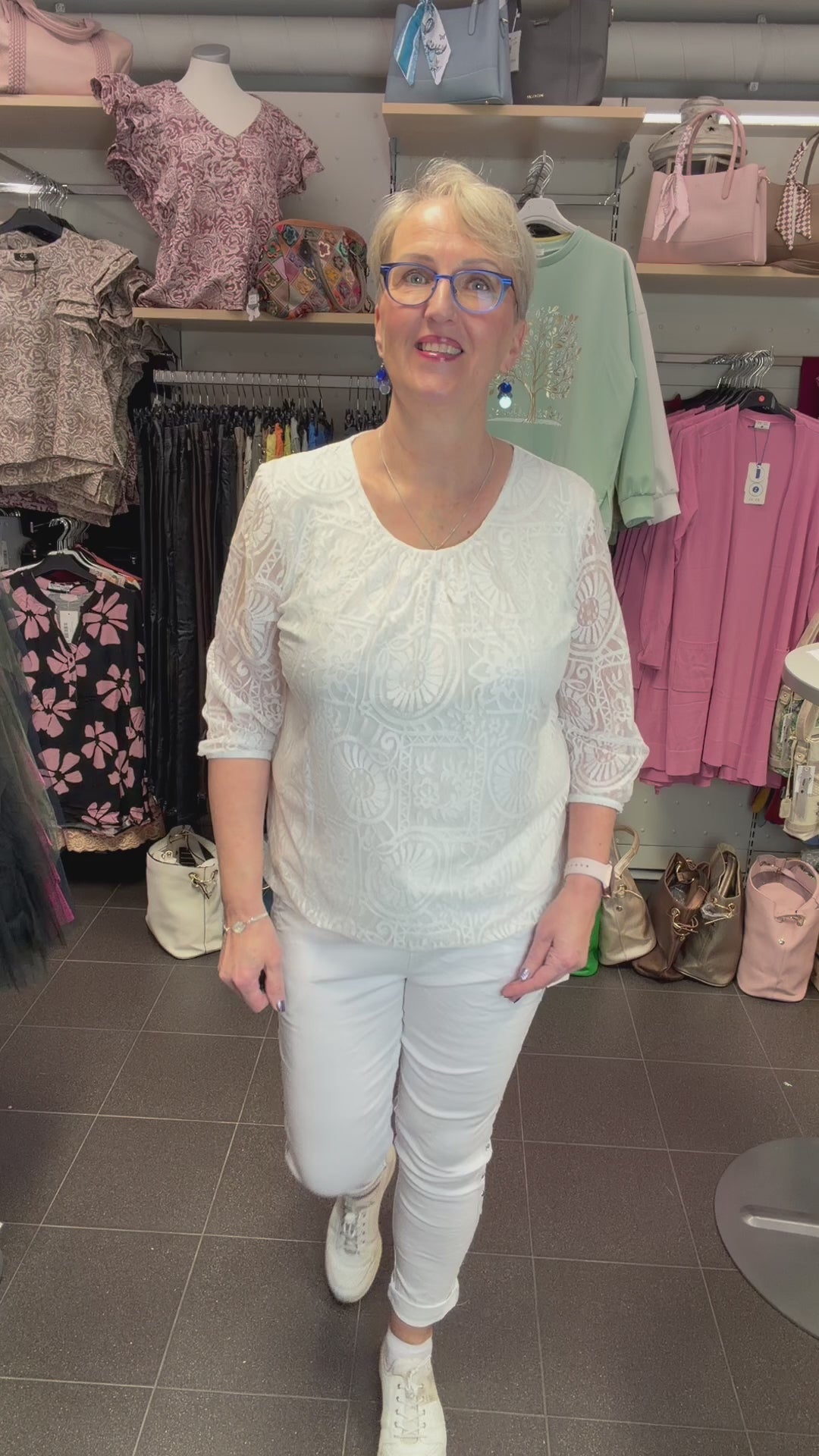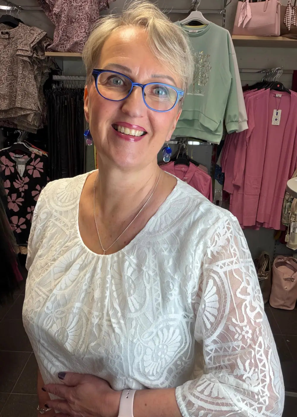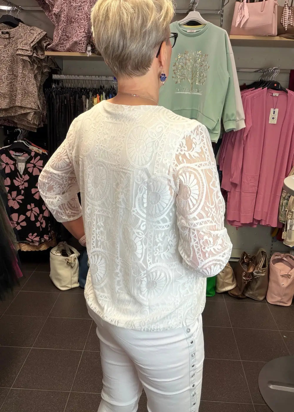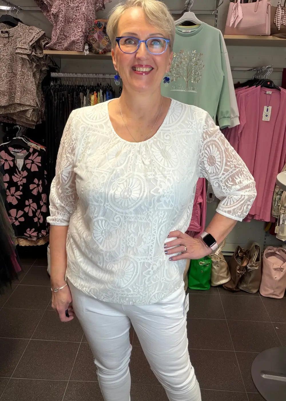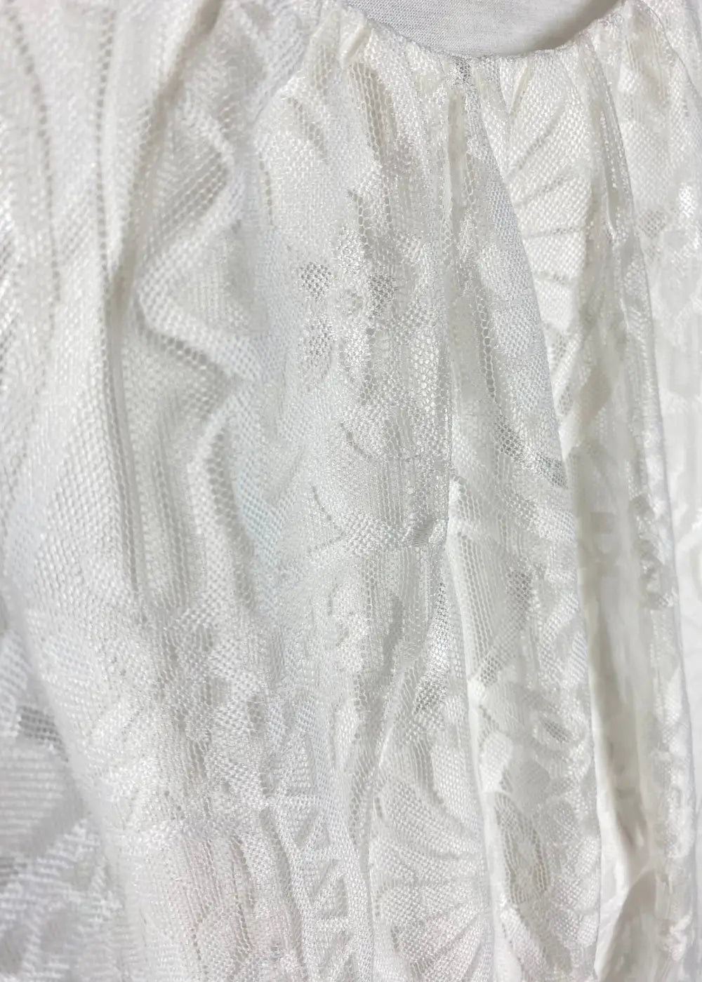 - Herkkä valkoinen pitsipusero romanttisella ilmeellä