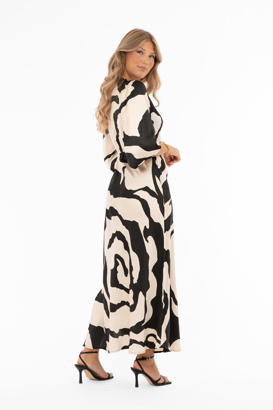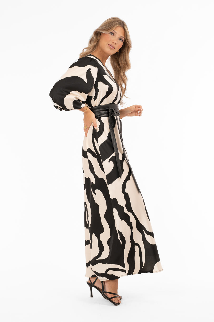 - Ylellinen satiinimekko abstraktilla mustalla kuviolla shampanjan sävyisellä pohjalla