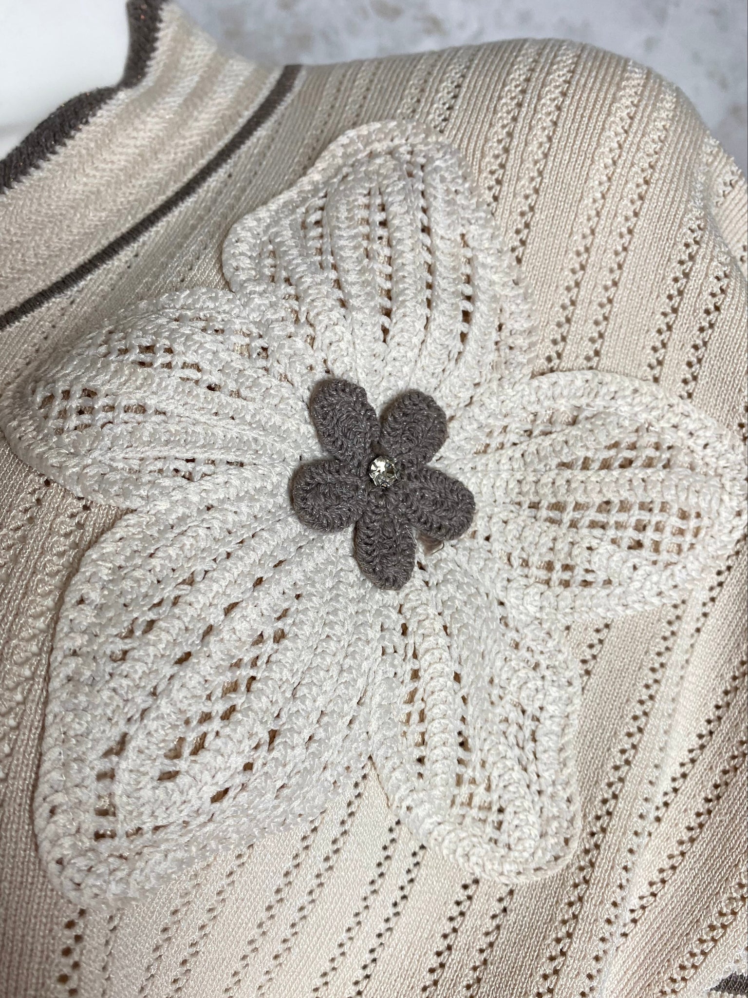 - Edessä strassikoristeltu ja kirjailtu kukka tuo näyttävän yksityiskohdan