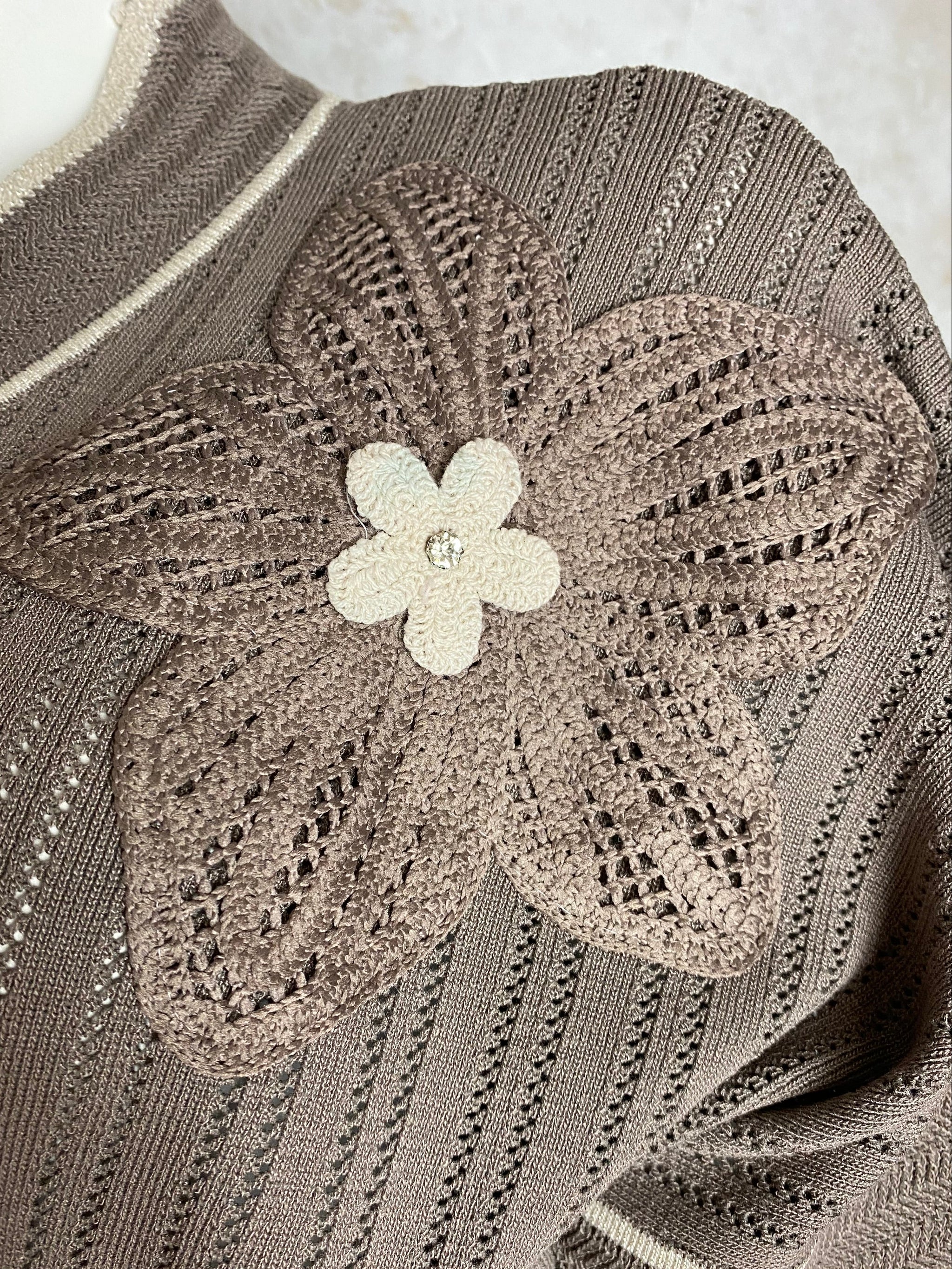 - Edessä strassikoristeltu ja kirjailtu kukka tuo näyttävän yksityiskohdan