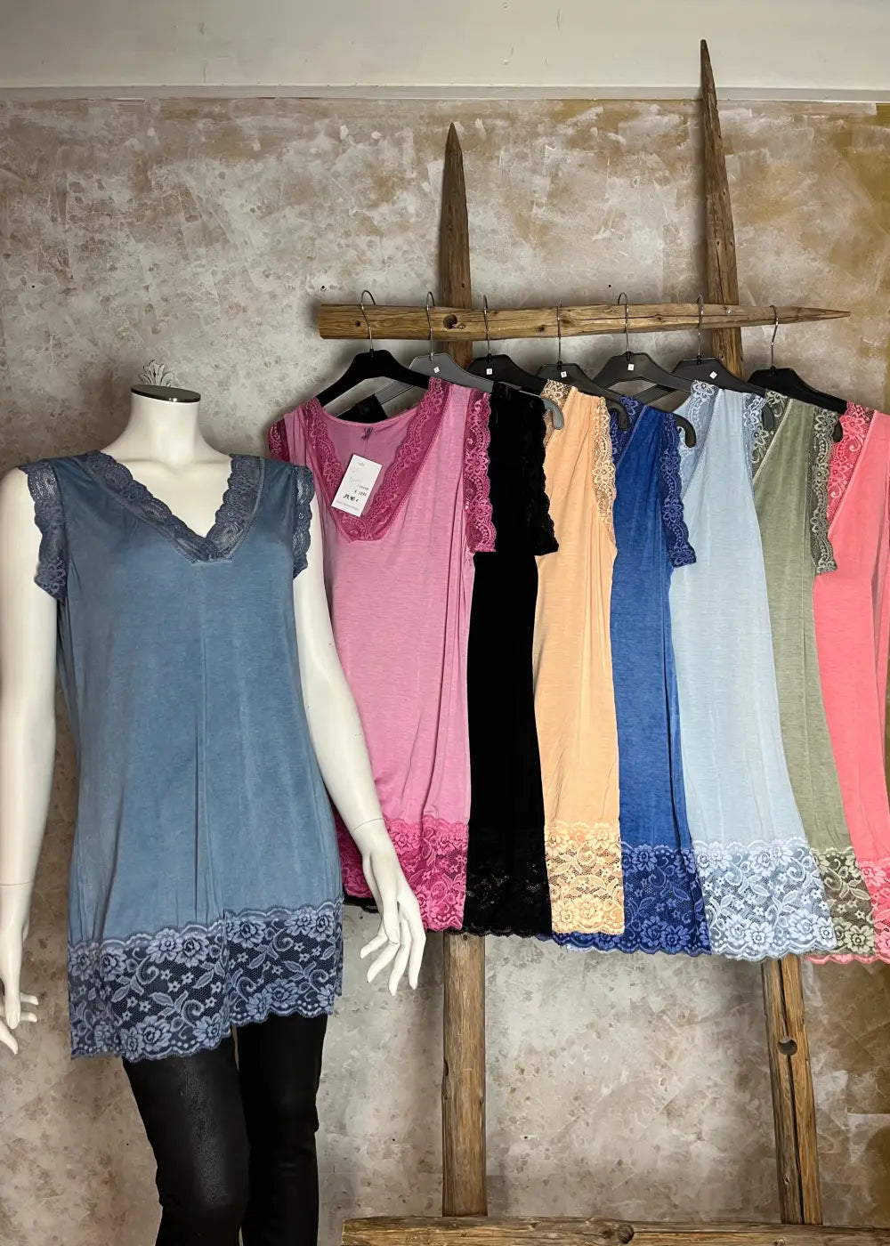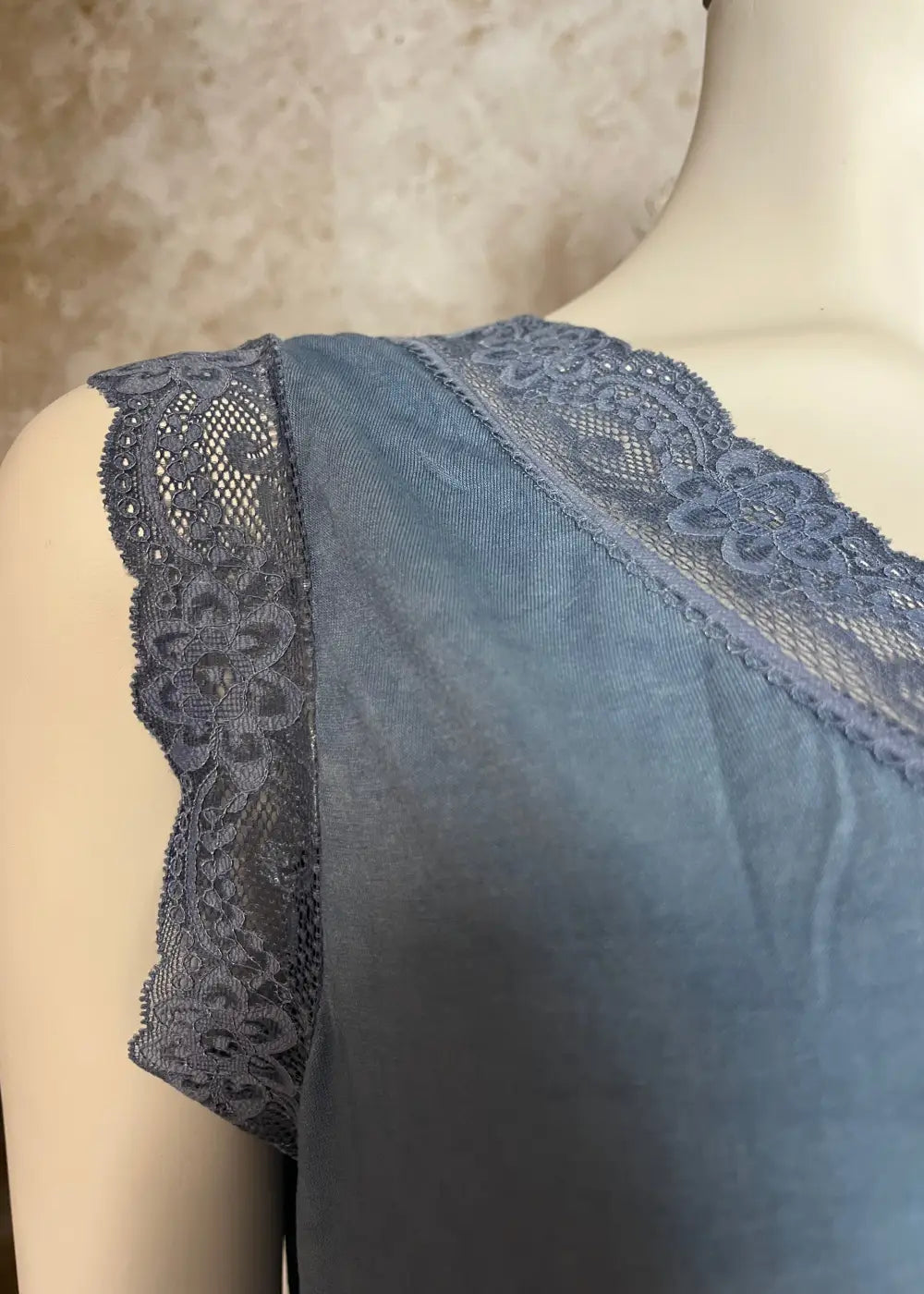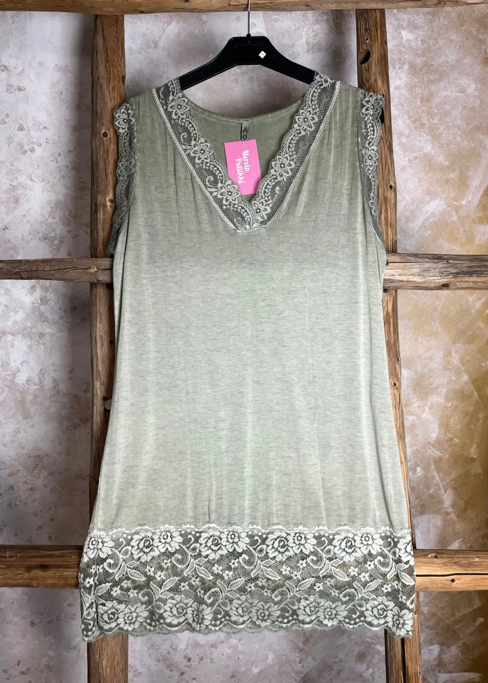 - Kauniit, leveät pitsireunukset olkaimissa ja helmassa tuovat herkkää ja naisellista ilmettä